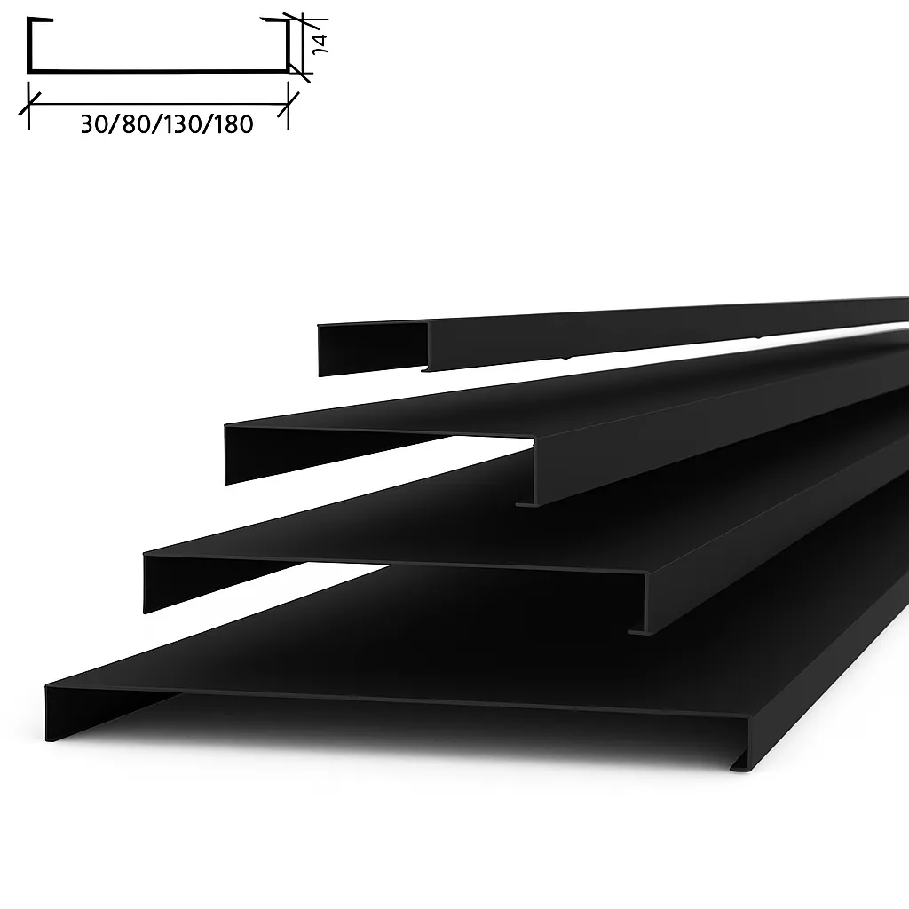 Албес A80SV в чёрном цвете — потолочная рейка прямоугольного сечения 80×14 мм, выполненная из алюминия или оцинкованной стали. Элегантный чёрный цвет делает потолок выразительным и современным. Система монтажа — на открытую гребёнку BTS с модульным шагом 100 мм.