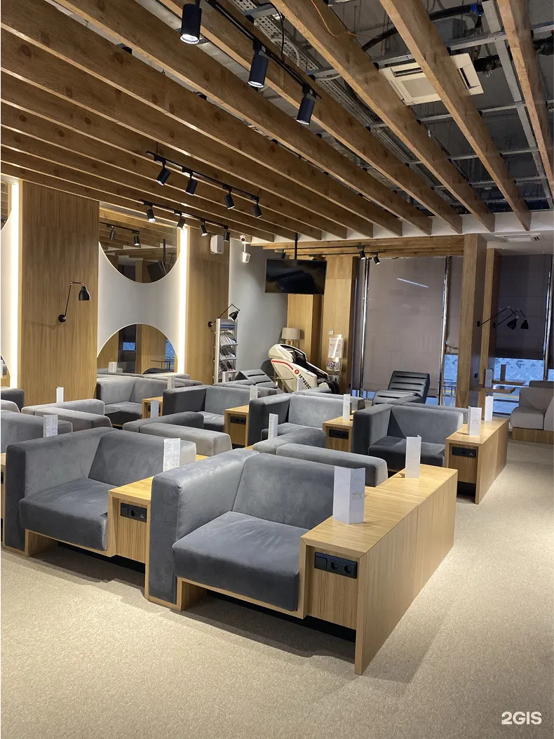 • Использованы рейки кубообразного профиля, имитирующие дерево — придающие пространству теплоту и визуальный уют.